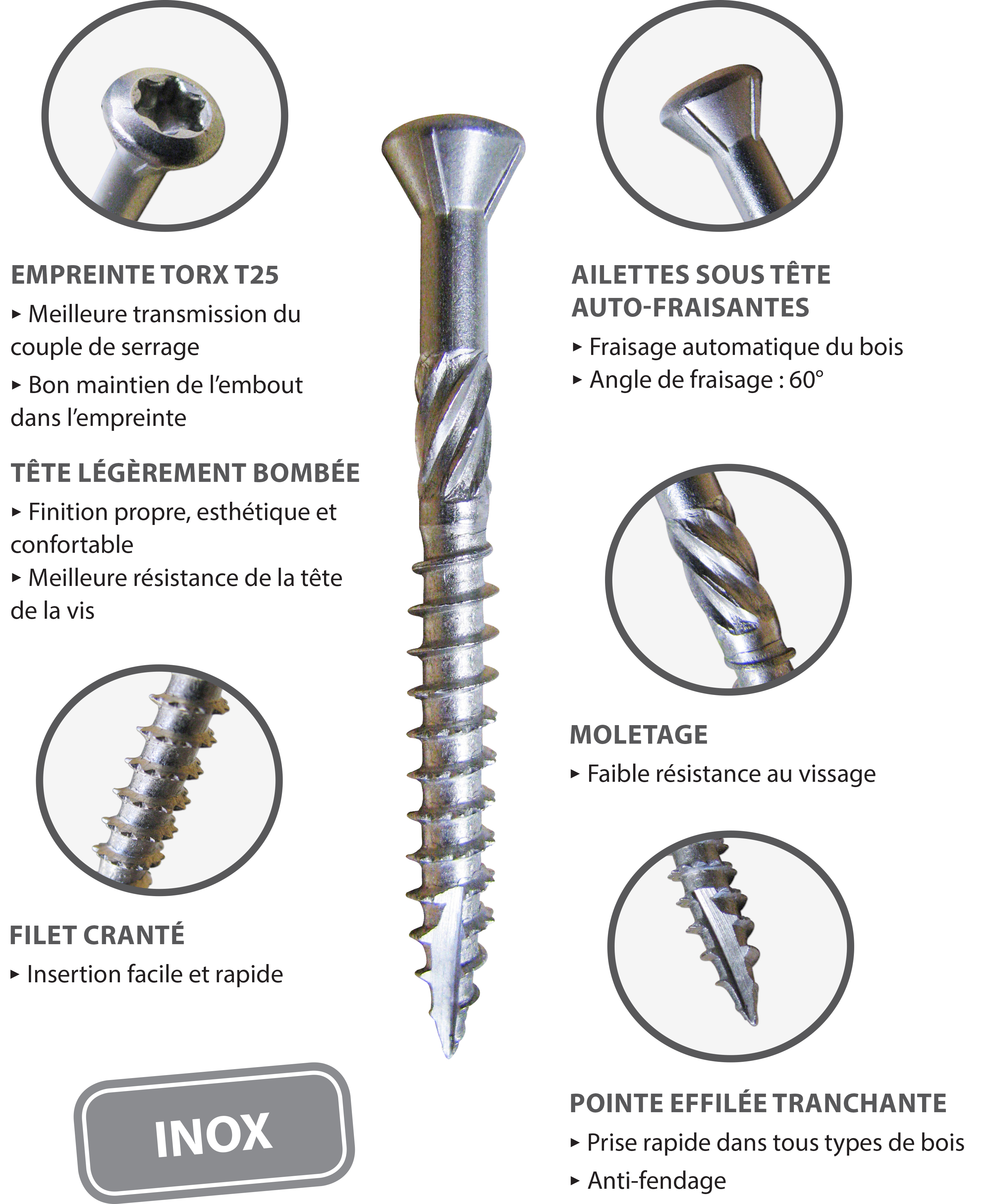 - No need to pre-drill (depending on the type of wood – install in accordance with French Unified Technical Document 51.4): quick and easy.