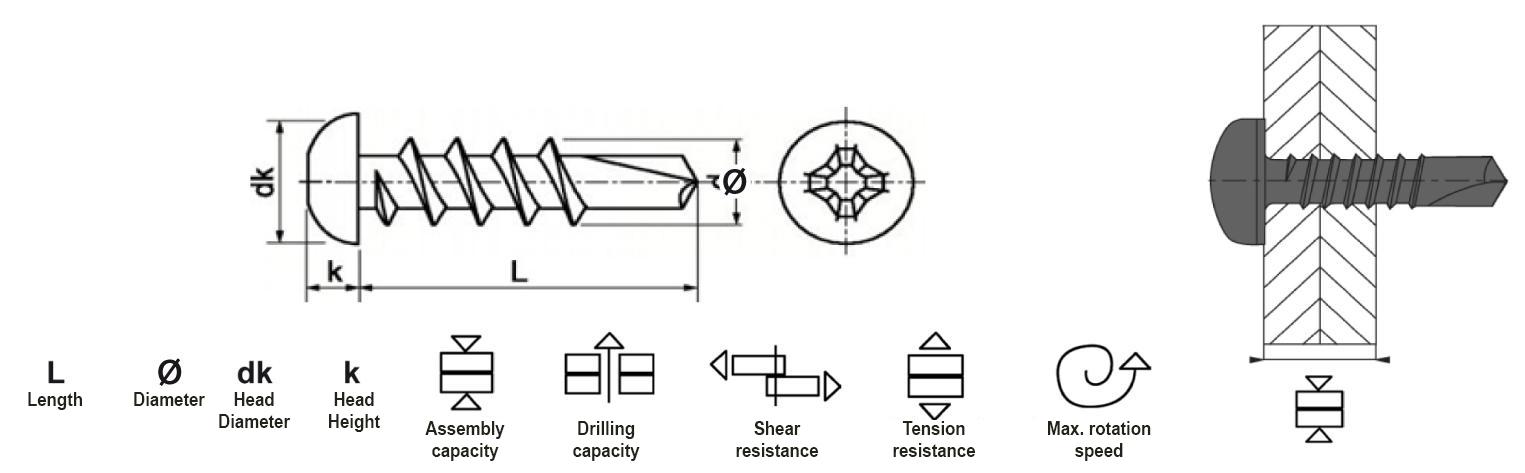 | 4,2 x 22 | 4,2 | 22 mm | PH 2 | 8,2 mm | 3,05 mm | 15 mm | 3,5 mm | 430 kg | 700 kg | 2500 tr/min |