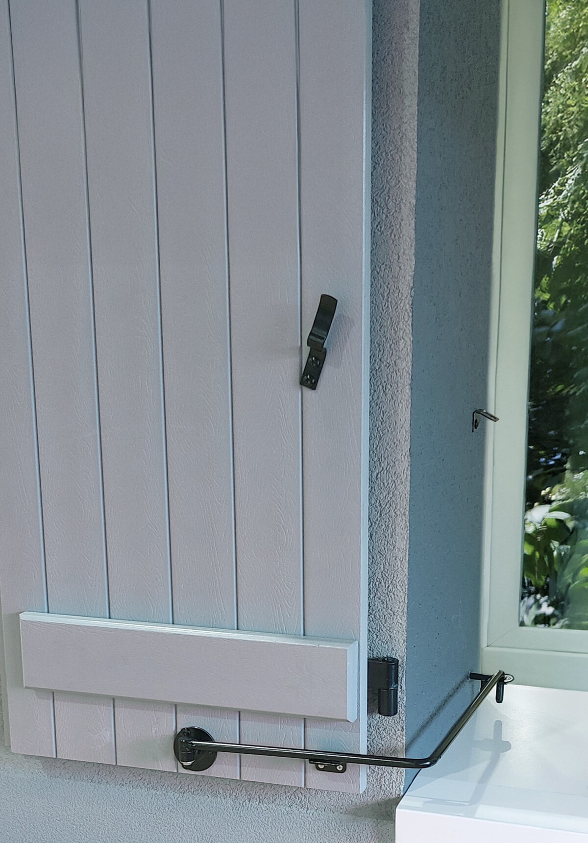 - Fixation lorsque les retours de tableaux sont très larges pour pouvoir ouvrir et fermer facilement les volets de l’intérieur.
