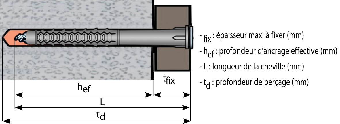 | Ø Cheville | L | td | Perçage | tfix | hef | empreinte |