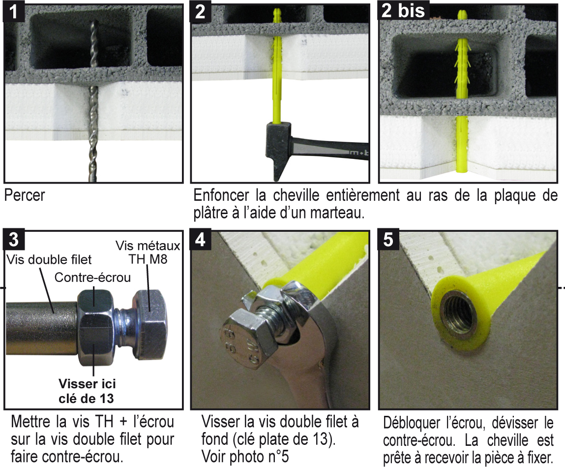 - Cheville longue pour tous matériaux avec doublage plaque de plâtre + isolant.