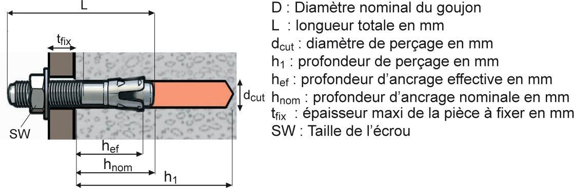| Goujon fileté galvanisé | dcut | L | tfix | h1 | hef | SW |