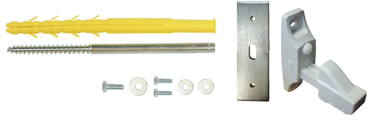 - Contenu : 2 arrêts de volet automatiques, 2 chevilles Ø12 x 240, 2 vis double filet Ø10 x 240, 2 vis TF M8, 2 rondelles Ø8, 4 vis TH M6, 4 Rondelles Ø6 et 2 platines.