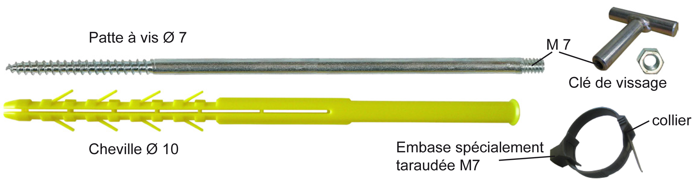 - Contenu : 6 chevilles, 6 vis double filet, 6 embases collier électricien taraudée M7, 6 colliers électricien, 1 écrou (pour faire contre-écrou) et une clé de vissage.