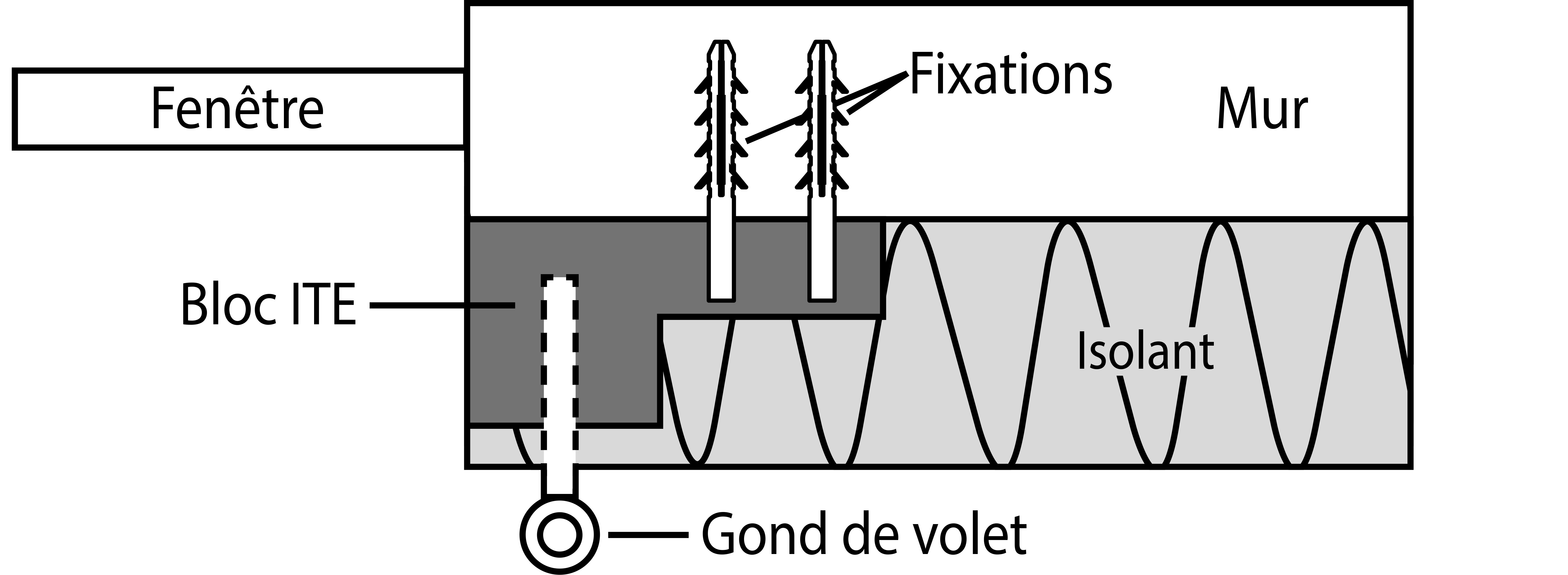 - Bloc ITE + fixations pour déporter les gonds de volets dans le cadre d’une isolation par l’extérieur.