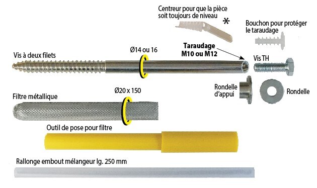 - Contenu : vis double filet femelle + vis TH + filtre métallique (non fourni dans les boîtes) + rondelle + bouchon pour protéger le taraudage + outil de pose pour le filtre + rondelle d'appui.